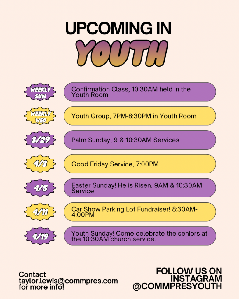 CommPres Youth (CPY) is a student ministry at Community Presbyterian Church for all 6th-12th grade students.